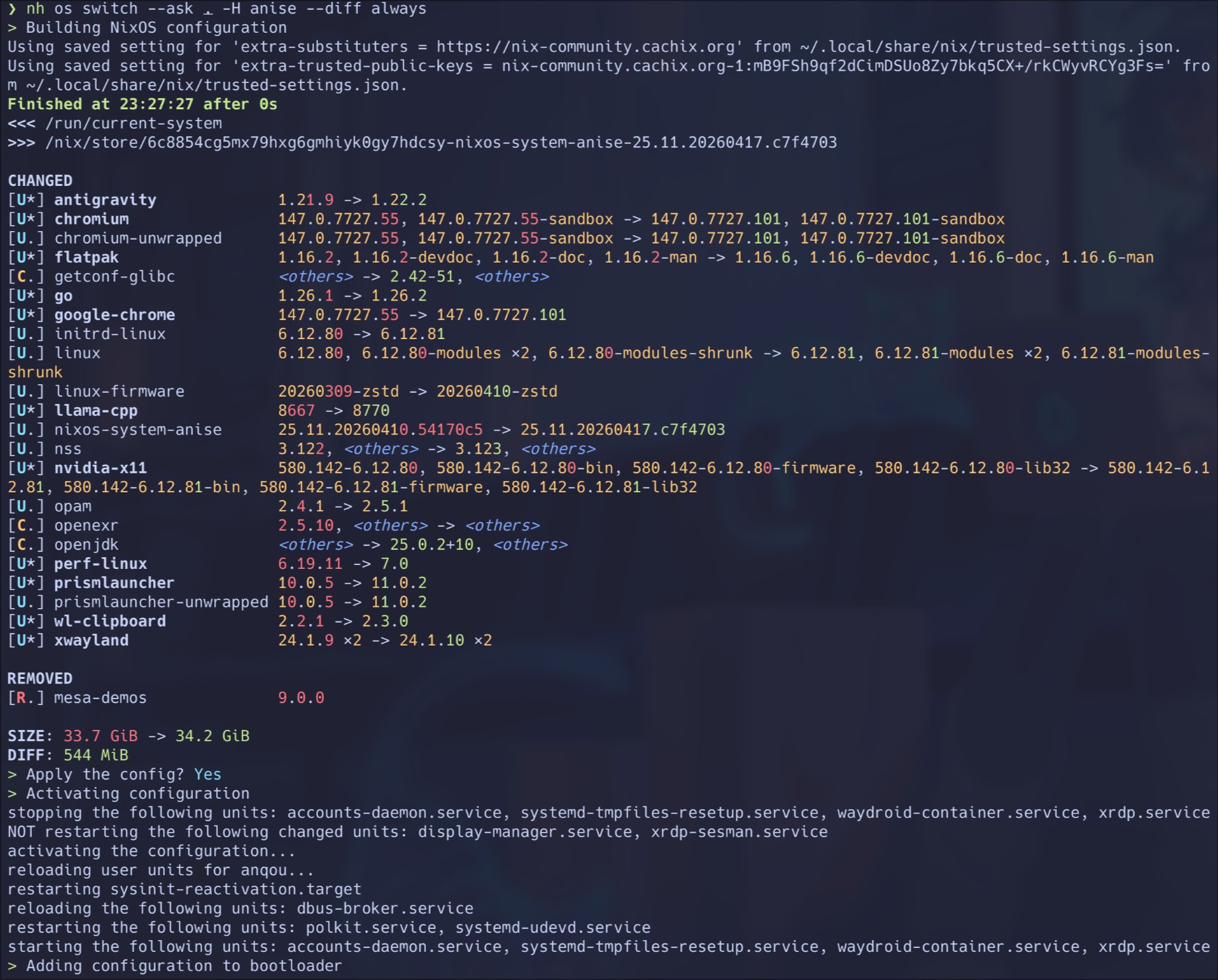 Done. The new configuration is /nix/store/6c8854cg5mx79hxg6gmhiyk0gy7hdcsy-nixos-system-anise-25.11.20260417.c7f4703
